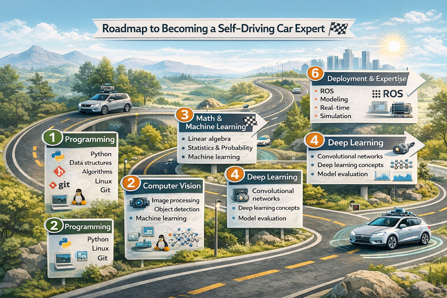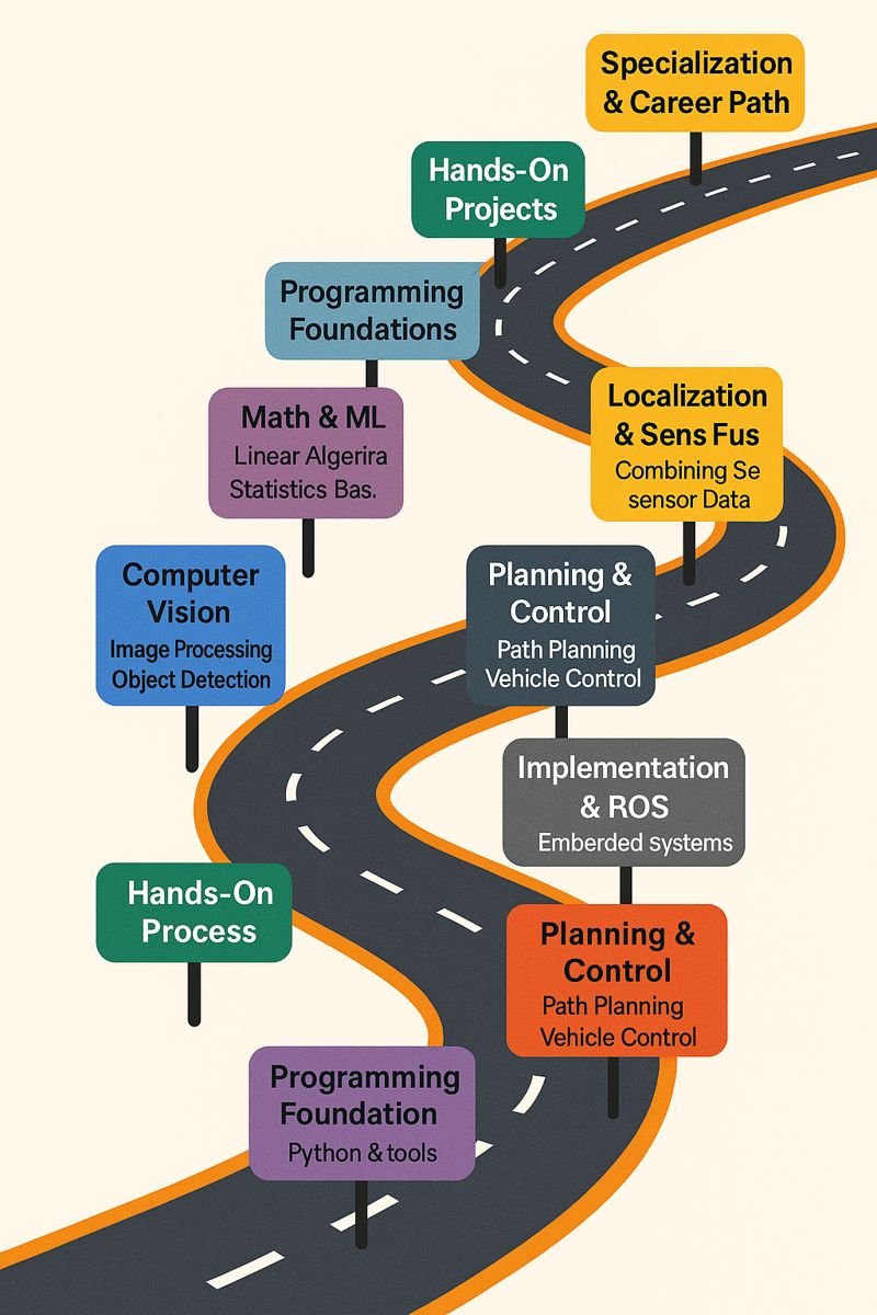 مسیر تبدیل شدن به یک متخصص خودروهای خودران، یک مسیر خطی و تکموضوعی نیست؛ بلکه ترکیبی از مهارتهای نرمافزاری، ریاضیات، هوش مصنوعی، بینایی ماشین و سیستمهای کنترلی است. این نقشهراه جادهای، مهمترین ایستگاههای یادگیری را نشان میدهد و کمک میکند بهجای پراکندهخوانی، قدمبهقدم و هدفمند پیش بروید. در این مسیر، هر مرحله بر پایه مرحله قبل ساخته میشود و نتیجه آن، توانایی پیادهسازی پروژههای واقعی در حوزه خودروهای هوشمند خواهد بود.