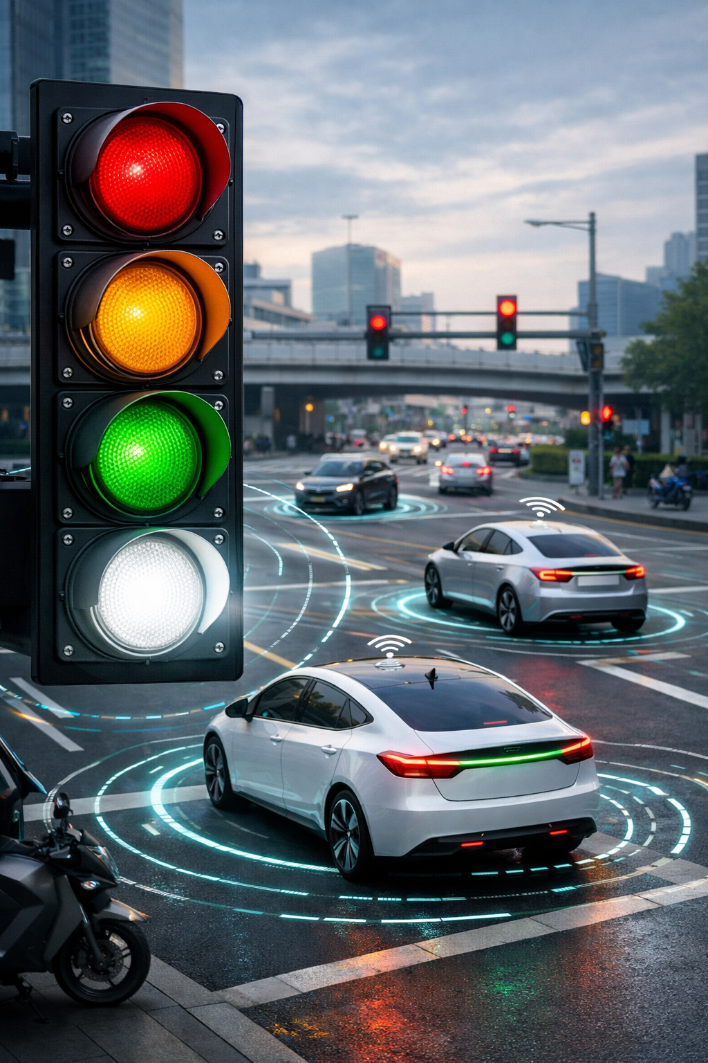 خودروهای خودران برای درک این وضعیت نیازی به دیدن چراغ سفید ندارند، زیرا از طریق ارتباطات بیسیم با زیرساخت تقاطع و سایر خودروها در تعامل هستند. در واقع، چراغ سفید بیشتر نقش یک رابط ارتباطی ساده برای انسانها را ایفا میکند تا آنها بدانند در حال ورود به یک تقاطع با مدیریت هوشمند هستند.